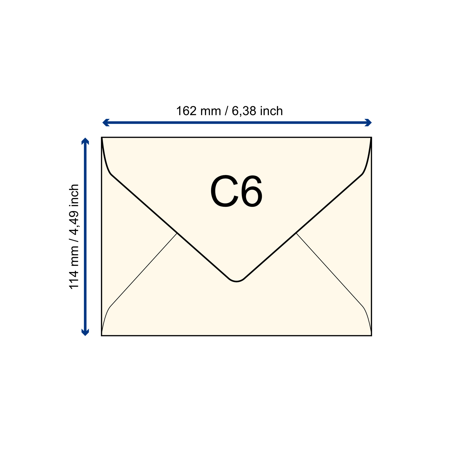 Das Format C6 (11,4 x 16,2 cm) ist ein DIN Format und nimmt bequem eine klassische Postkarte (A6) einen 1 mal gefalteten A5- oder einen 2-mal halbierten A4-Bogen auf.