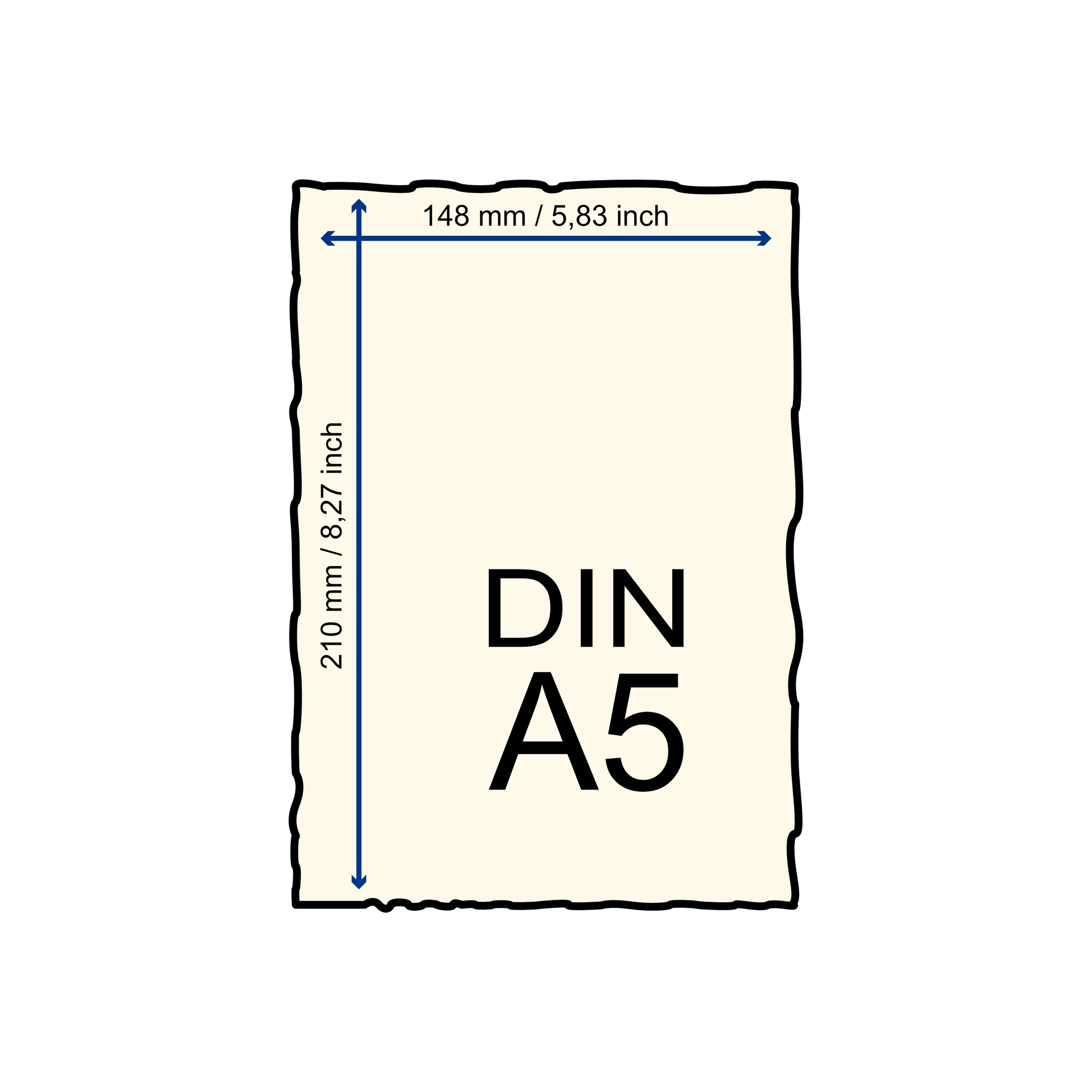 DIN-A5 ist etwas großzügiger als die Postkarte und geeignet für kurze Briefe, ausführlichere Einladungen und kleine Menüs, aber auch etwa für kleinformatige Kunstdrucke. Einmal gefaltet ergibt sich eine schöne Klappkarte im Postkartenformat. Die Karten werden direkt in diesem Format geschöpft, weisen also einen echten umlaufenden Büttenrand auf.